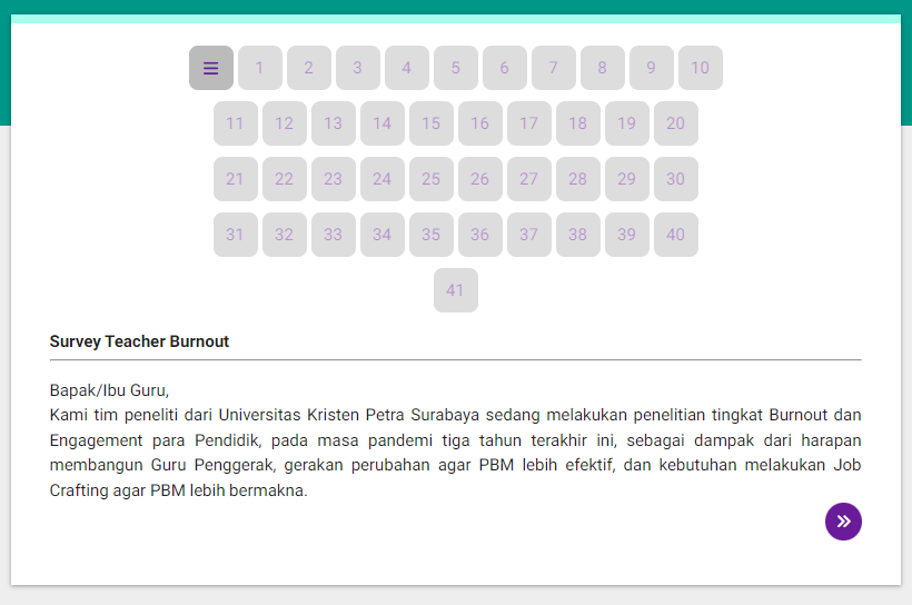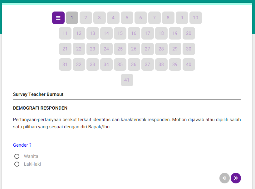 bila menu Survey Teacher Burnout di klik akan menampilkan pengisian data angket oleh responden. Berikut adalah tampilan untuk pengisian data angketnya.